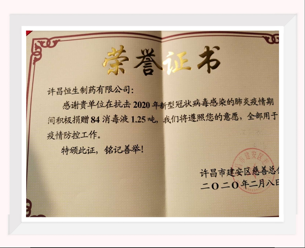 在得知相關(guān)防疫物資需求量不斷上升,各項(xiàng)物資處于緊缺的情況下,許昌恒生制藥有限公司第一時(shí)間通過(guò)許昌市建安區(qū)慈善總會(huì)捐贈(zèng)84消毒液1.25噸,全部用于疫情防控工作。